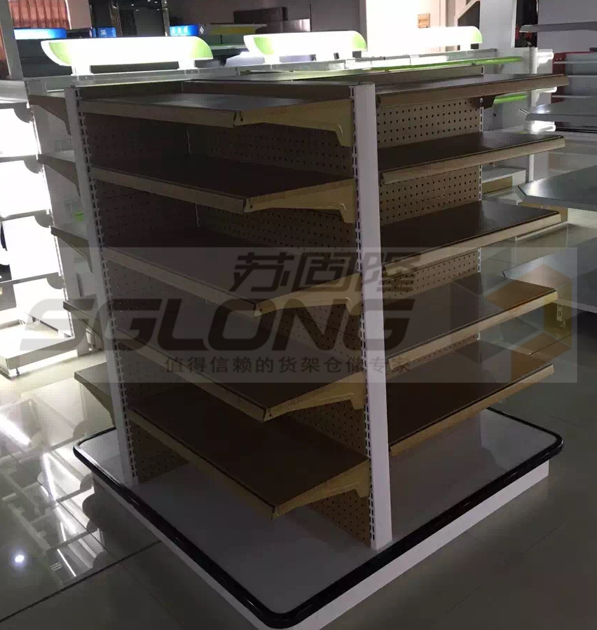 Эта двусторонняя гондольная полка имеет перфорированную заднюю панель и регулируемые металлические полки, идеально подходят для супермаркетов и розничных магазинов.